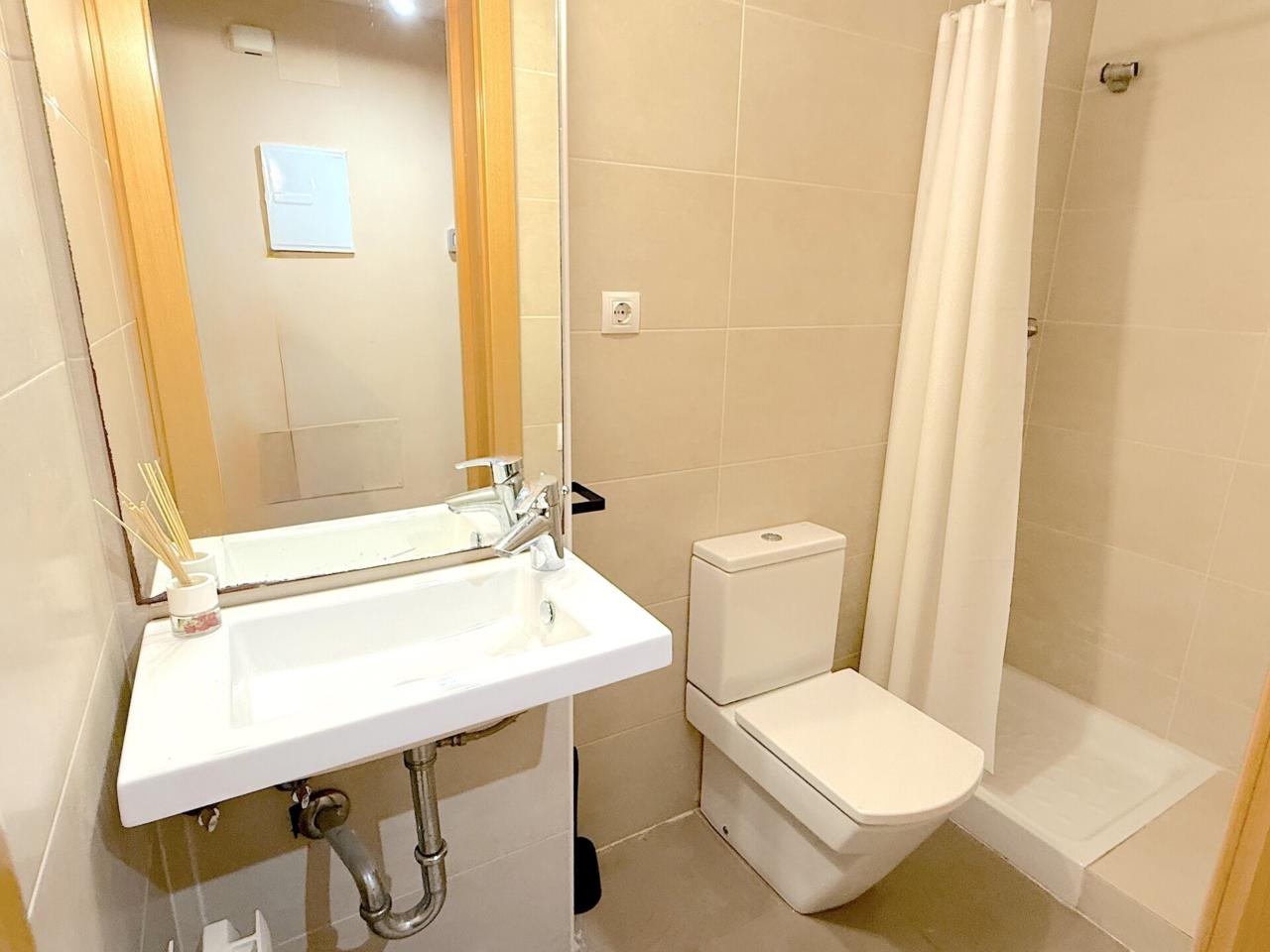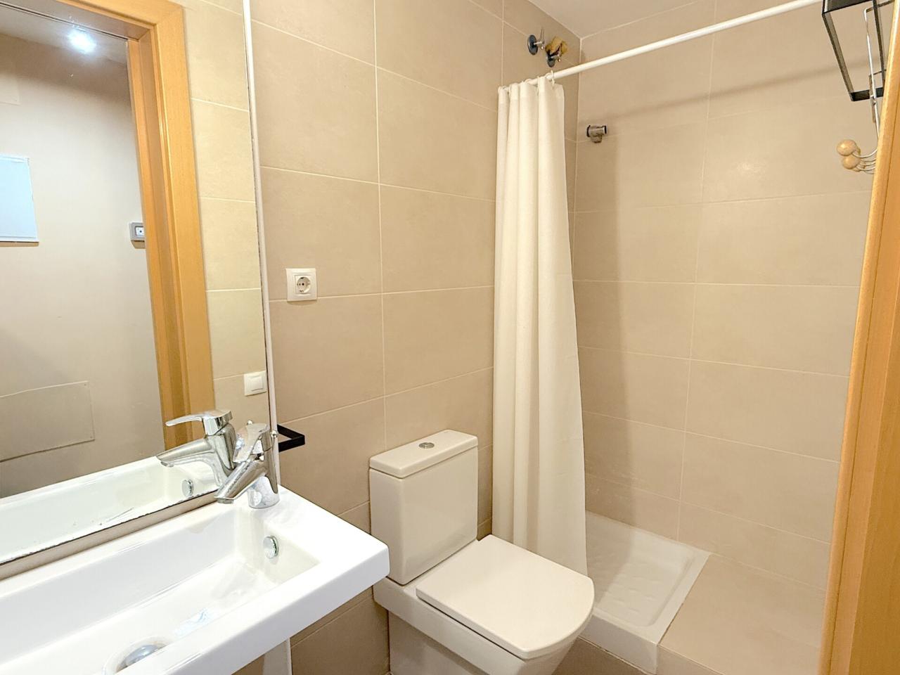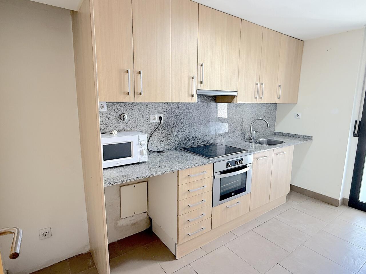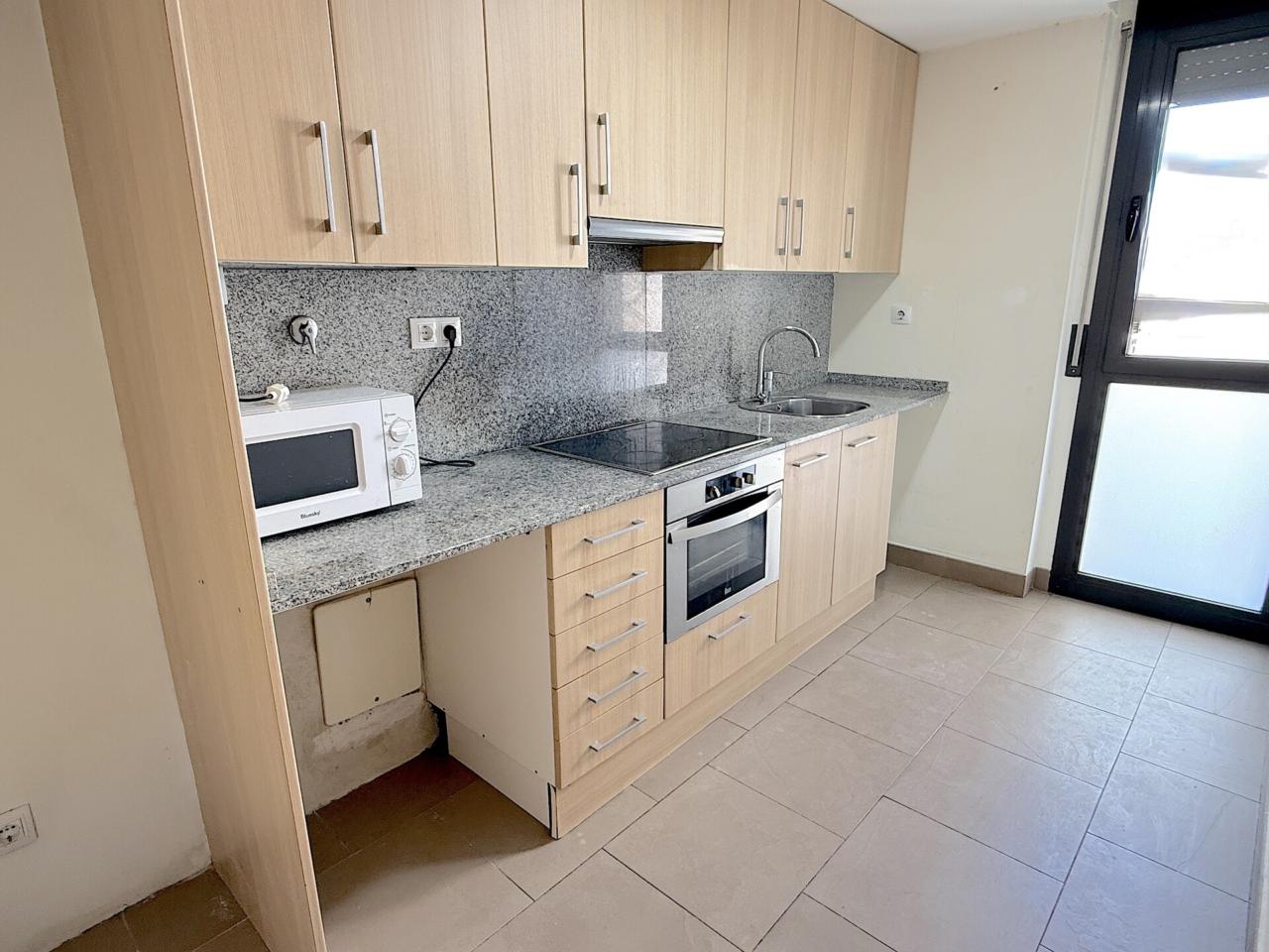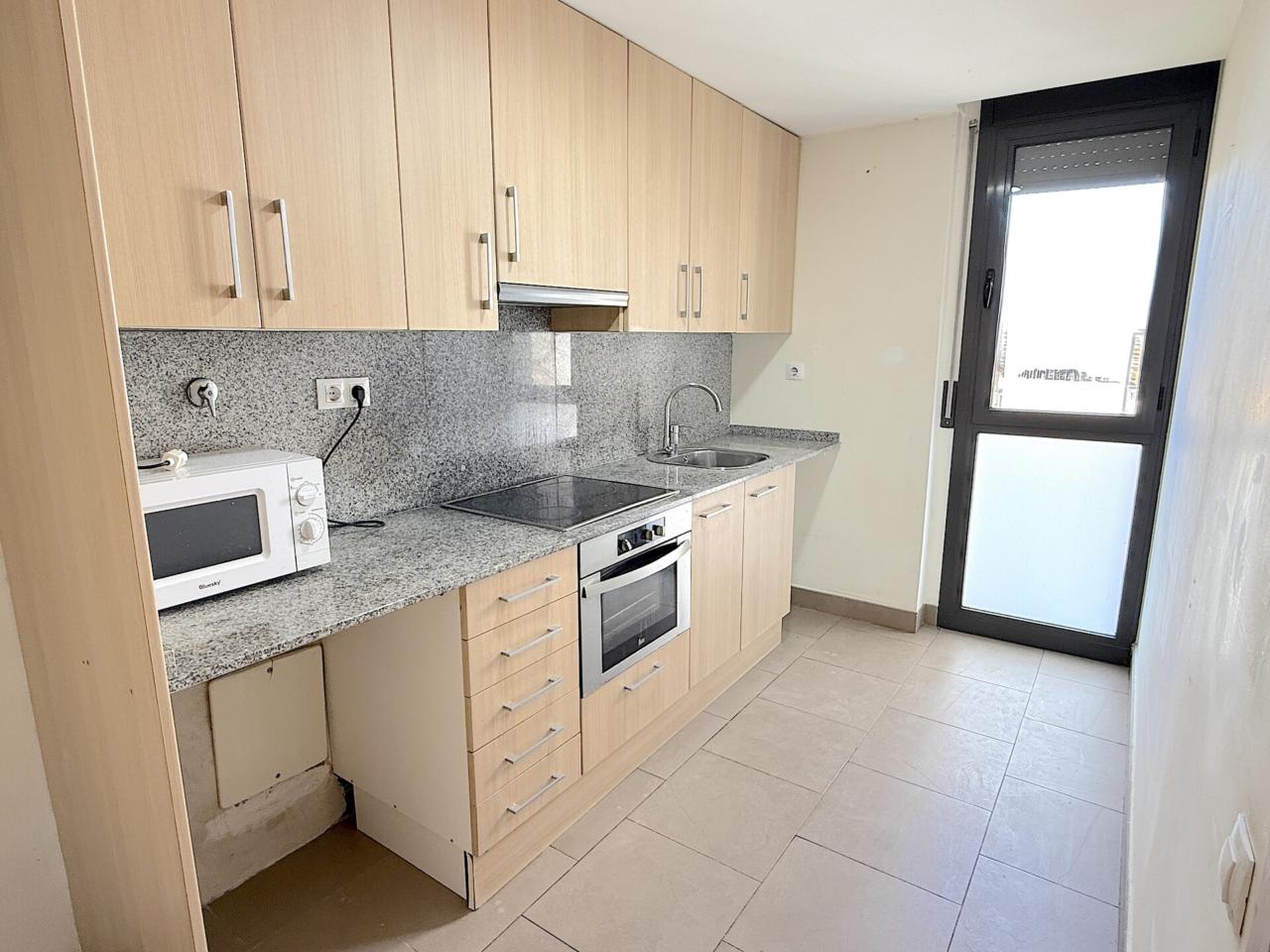 Planta baja: recibidor, un salón-comedor de 19m con salida a un balcón, amplia cocina independiente con armarios claros de madera y exterior; y un baño de 3 piezas con ducha, váter y lavabo.