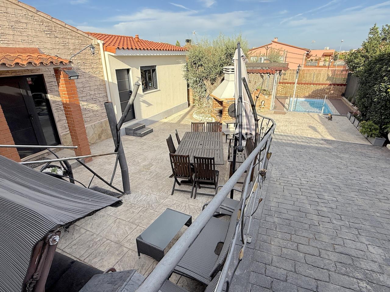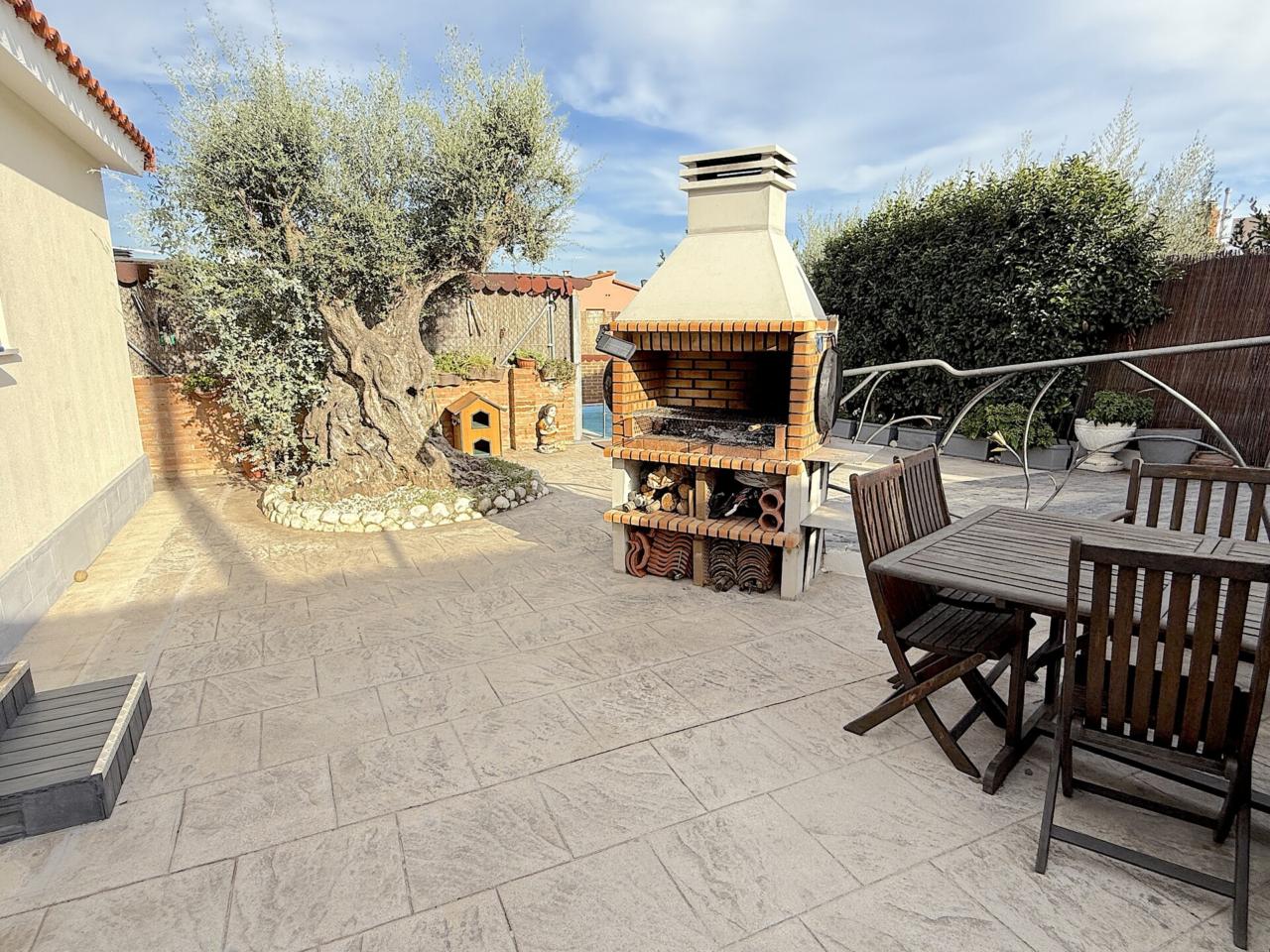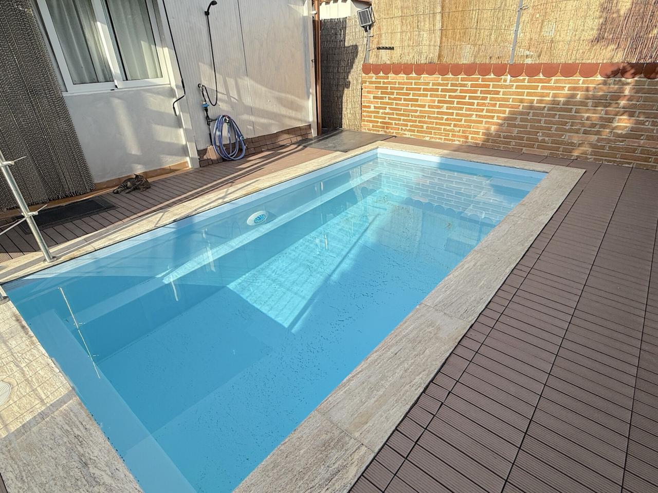 El jardín tiene una piscina con agua salada y zona de barbacoa.